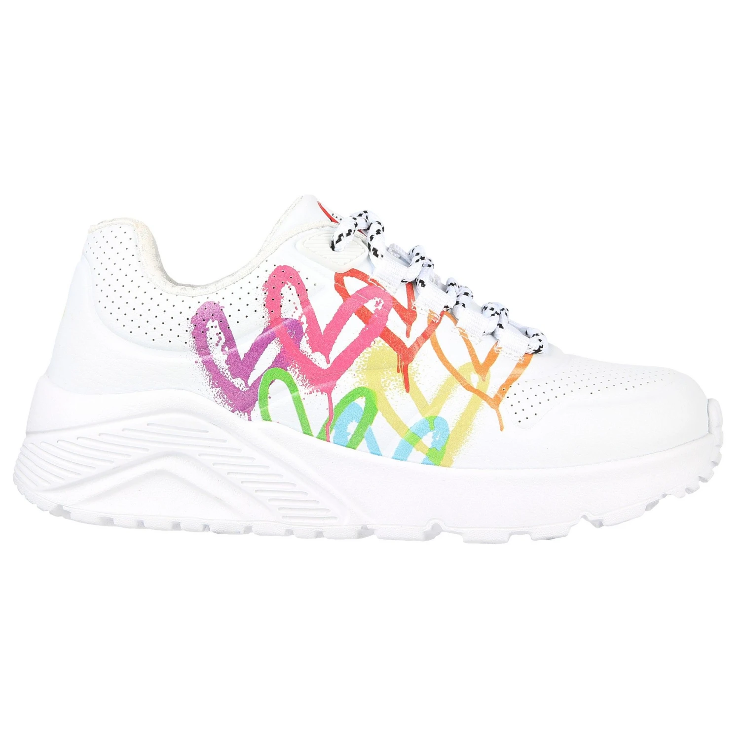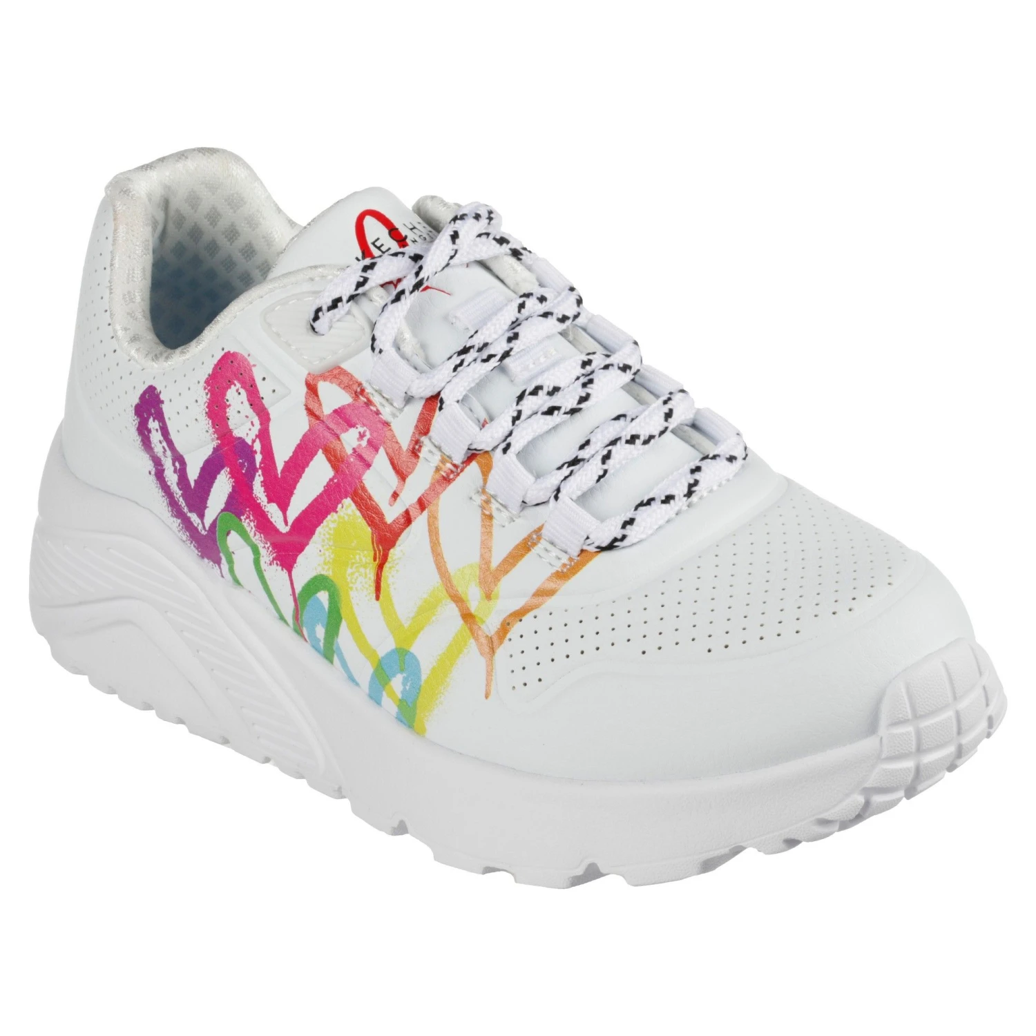 De Skechers Uno Lite – Love Brights vrijetijdsschoenen voor kinderen hebben het hart design van de kunstenaar James Goldcrown. Deze schoenen hebben een goede grip en de binnenzool is gemaakt met Air Cooled Memory Foam. Zo zitten de schoenen comfortabel en stevig.