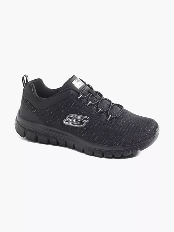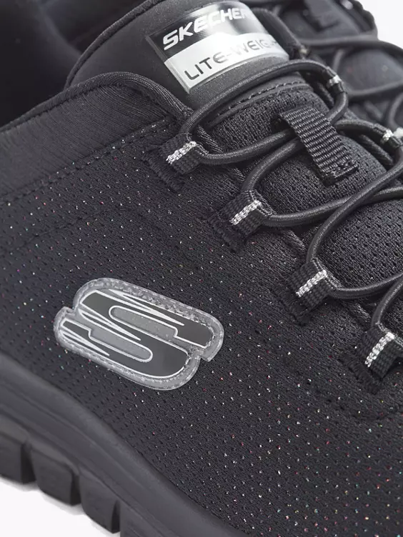 Ben je op zoek naar trendy en comfortabel? Kies dan voor een sportieve sneaker van het merk Skechers. De zwarte sneaker heeft een elastische vetersluiting en is gemaakt van een gebreid (knitted) materiaal in een subtiel motief. Dankzij het memoryfoam voetbed lijkt het alsof je op wolkjes loopt.